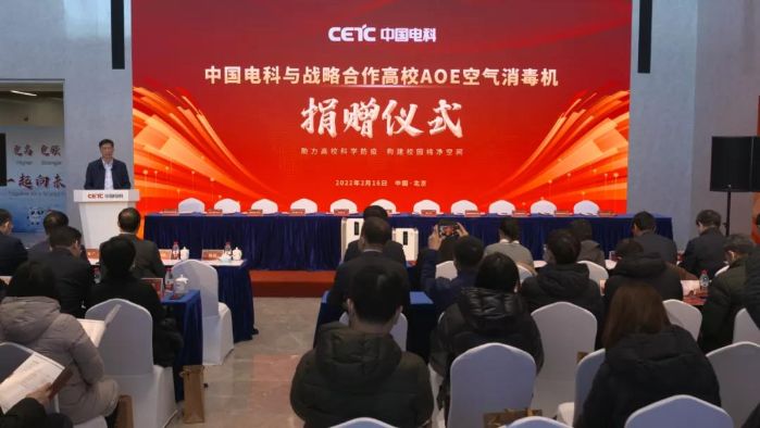 2月16日,中國電科在京舉行“助力高校科學防疫 構建校園純凈空間”——AOE空氣消毒機捐贈儀式,向清華大學、北京大學、北京航空航天大學、北京郵電大學、北京理工大學等全國十所高校捐贈了最新研制的空氣消毒機,助力校園疫情防控。中國電科副總經理何松,國資委、教育部、工信部及上述高校相關領導出席活動。